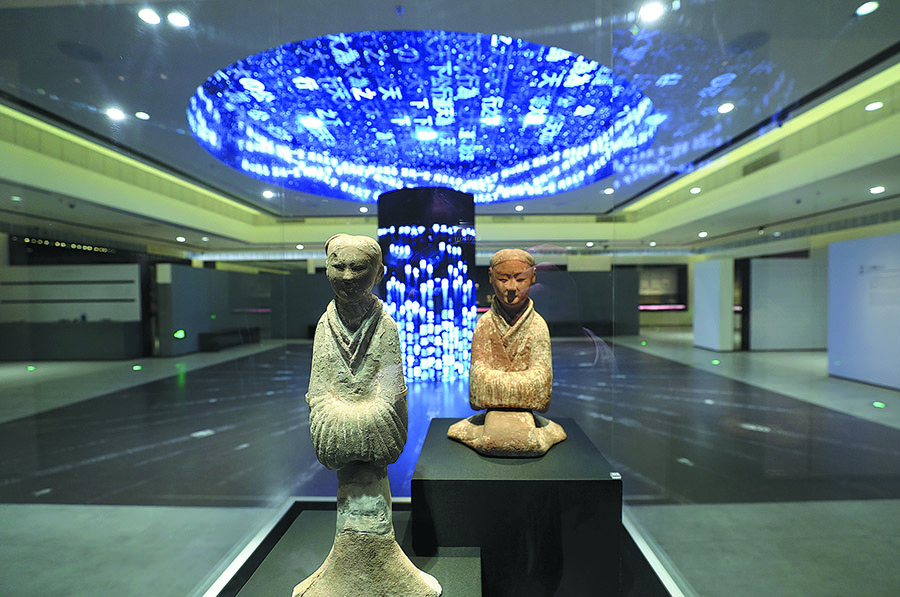 Two pottery figurines against the backdrop of a multimedia device, which illustrates the transformation of Chinese characters.[PHOTO BY ZOU HONG/CHINA DAILY]