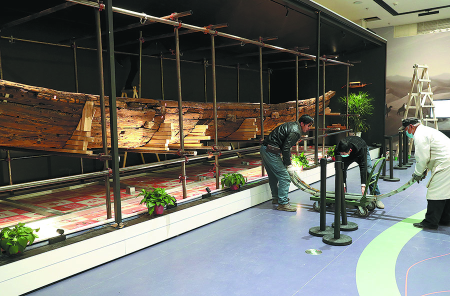 A Han Dynasty (206 BC-AD 220) wooden vessel on display undergoes repairs in January.[PHOTO BY ZOU HONG/CHINA DAILY]