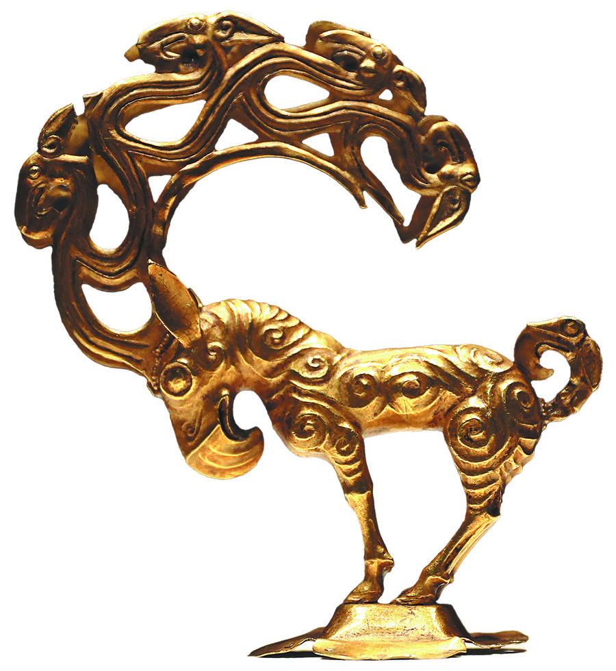 A gold decoration in the shape of a mythical beast at the exhibition.[PHOTO BY ZOU HONG/CHINA DAILY]