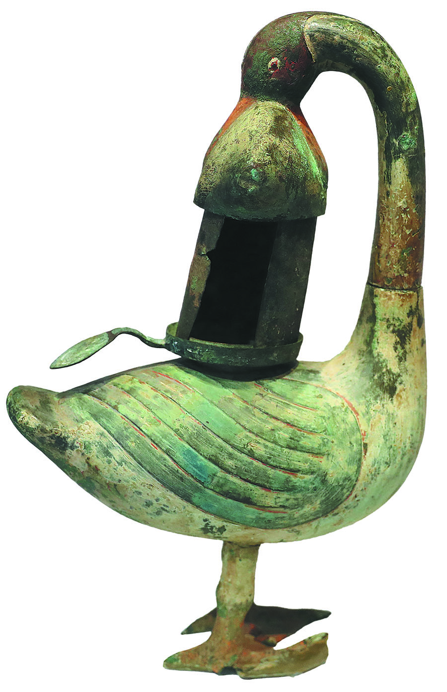 A painted bronze lamp in the shape of a wild goose chewing fish is on display.[PHOTO BY ZOU HONG/CHINA DAILY]