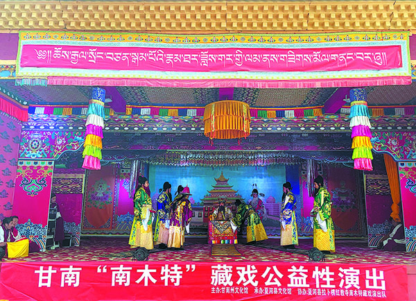 In a medium-sized courtyard in Wem village in the Gannan Tibet autonomous prefecture in Northwest China's Gansu province, residents are busy putting up colorful bunting and cleaning a stage. The stage, which stands about a meter high, is enclosed on three sides by walls adorned with paintings of various characters, and will serve as a matching backdrop for the upcoming performances of Namtar Tibetan opera.