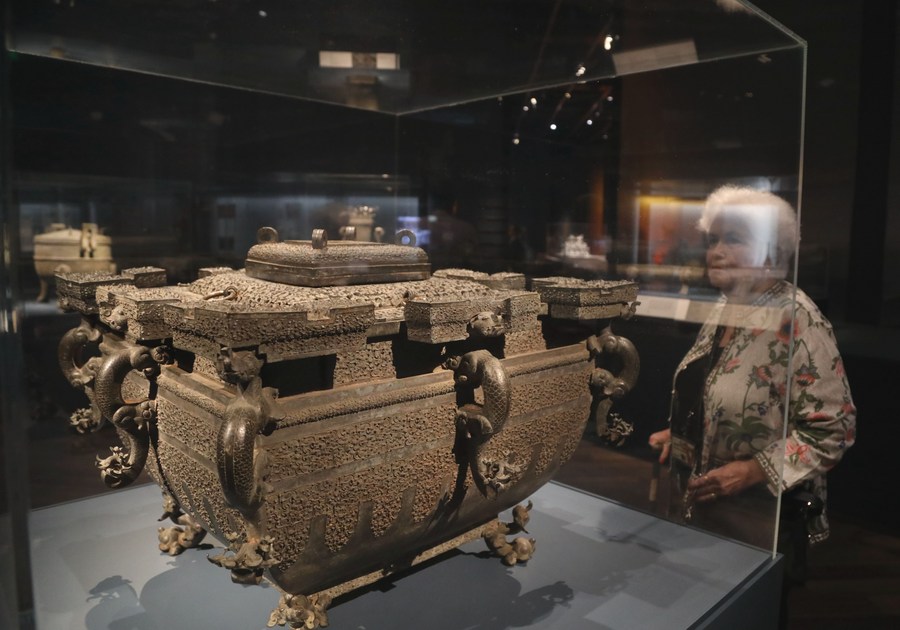 A visitor views an exhibit at a major exhibition of Chinese cultural relics from China's Bronze Age in San Francisco, California, the United States, April 19, 2024.(Xinhua/Wu Xiaoling)