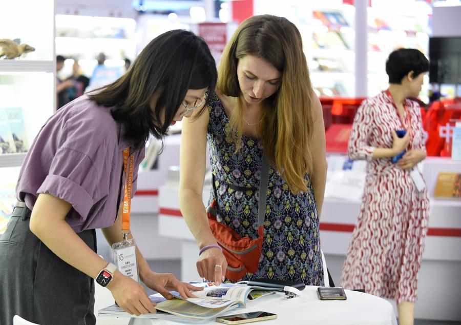 A staff member of a publisher communicates with a Russian business guest at the 30th Beijing International Book Fair in Beijing, capital of China, June 19, 2024. (Xinhua/Luo Xiaoguang)