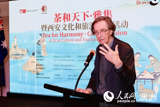 Ian Howard, professor in the Faculty of Art and Design, University of New South Wales, speaks at the opening ceremony of Tea for Harmony · Cultural Salon & Xi'an Culture and Tourism Promotion activity in Sydney, July 27, 2024. (Photo/Yuchen Bai)