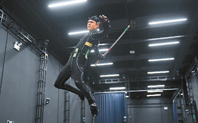 Yin Kai, who undertakes the majority of the action work for the protagonist of "Black Myth: Wukong," works at a motion capture workshop in Shenzhen, south China's Guangdong Province. (Xinhua/Mao Siqian)