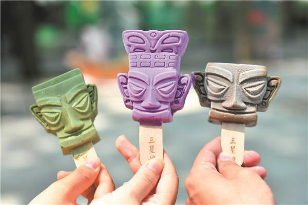 Ice creams replicating bronze masks at the Sanxingdui Museum in Guanghan, Sichuan province, are displayed.[Photo by Yi Fang/For China Daily]