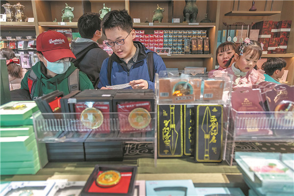 Customers view the cultural creative products at the souvenir shop of the Henan Provincial Museum in Zhengzhou, Henan province.[Photo provided to China Daily]