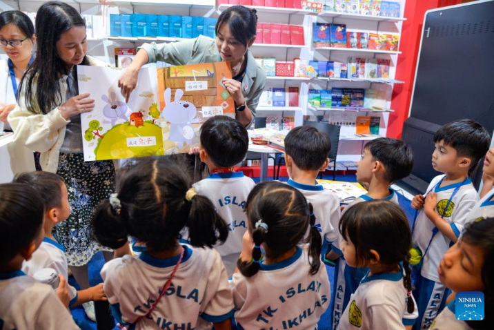 Children look at a Chinese book at the booth of China Publication during the 2024 Indonesia International Book Fair at Jakarta Convention Center in Jakarta, Indonesia, Sept. 25, 2024. (Xinhua/Xu Qin)