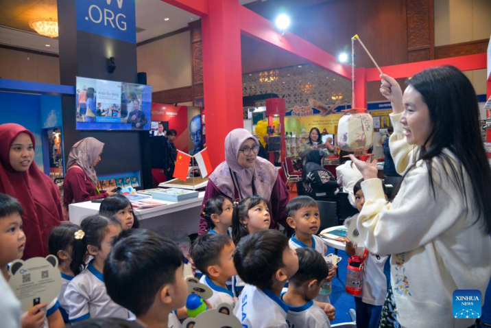 Children learn about Chinese culture at the booth of China Publication during the 2024 Indonesia International Book Fair at Jakarta Convention Center in Jakarta, Indonesia, Sept. 25, 2024. (Xinhua/Xu Qin)