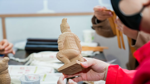 Visitors experience "repairing" Terracotta Warriors at the exhibition center.[Photo provided to chinadaily.com.cn]