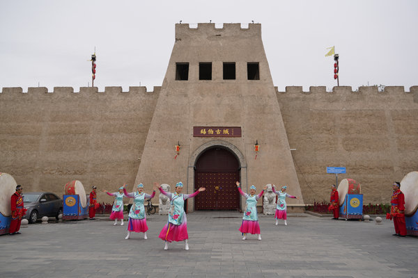 Performers in traditional costumes welcome tourists in a gate-opening ceremony of Xibe ancient city. [Photo by Xu Lin/China Daily]