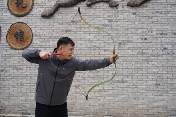 Zhao Hu, a craftsman who makes bows and arrows, practices archery.[Photo by Xu Lin/China Daily]