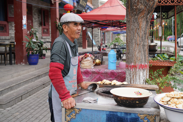 A local resident sells traditional snacks.[Photo by Xu Lin/China Daily]
