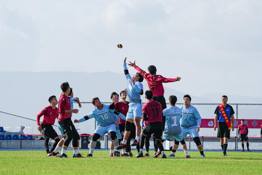 Players competes during the sparkler-grabbing game between Guangxi and Hebei at the 12th National Traditional Games of Ethnic Minorities of China in Sanya, south China's Hainan Province, Nov. 25, 2024. (Xinhua/Jinmeiduoji)