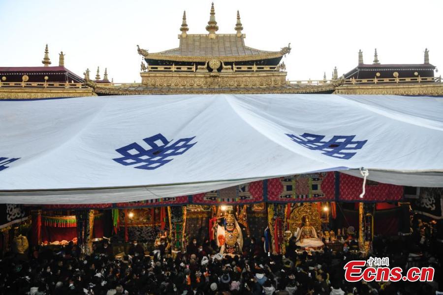 Women of the Tibetan ethnic group celebrate the Fairy's Day celebration in front of the Jokhang Temple in Lhasa, southwest China's Xizang Autonomous Region, Dec. 15, 2024. (Photo/China News Service)