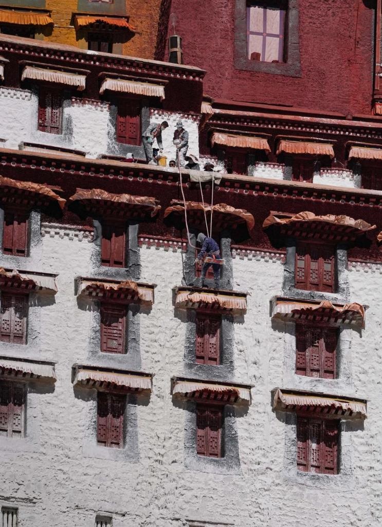 Workers paint the wall of the Potala Palace during an annual renovation of the ancient architectural complex in Lhasa, southwest China's Xizang Autonomous Region, Oct. 30, 2024. (Xinhua/Tenzing Nima Qadhup)