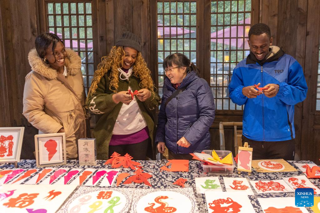 International students learn paper-cutting in Pianyan ancient town, Beibei District, southwest China's Chongqing Municipality, Jan. 7, 2025. A group of international students attended a cultural event here on Tuesday to experience traditional Chinese culture. (Xinhua/Huang Wei)