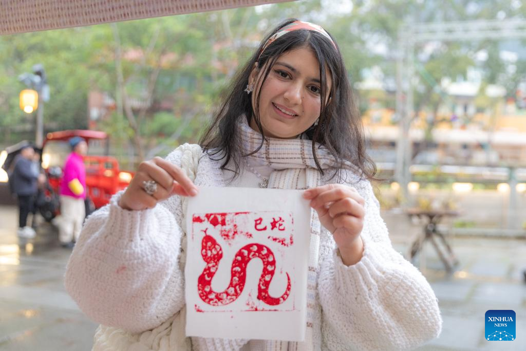 An international student displays her rubbing work in Pianyan ancient town, Beibei District, southwest China's Chongqing Municipality, Jan. 7, 2025. A group of international students attended a cultural event here on Tuesday to experience traditional Chinese culture. (Xinhua/Huang Wei)