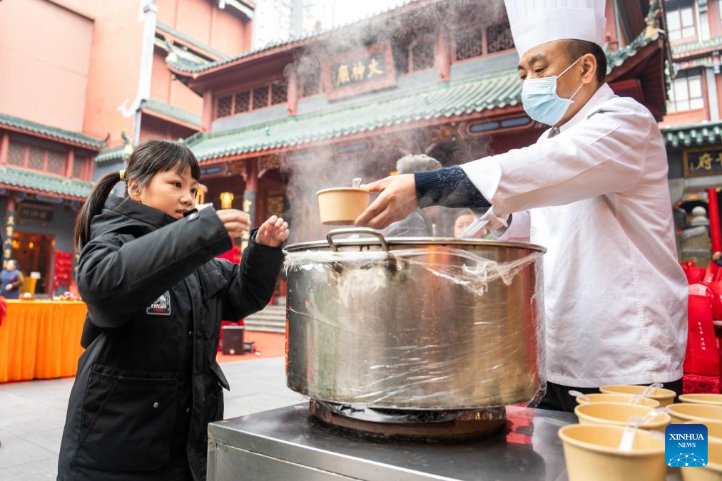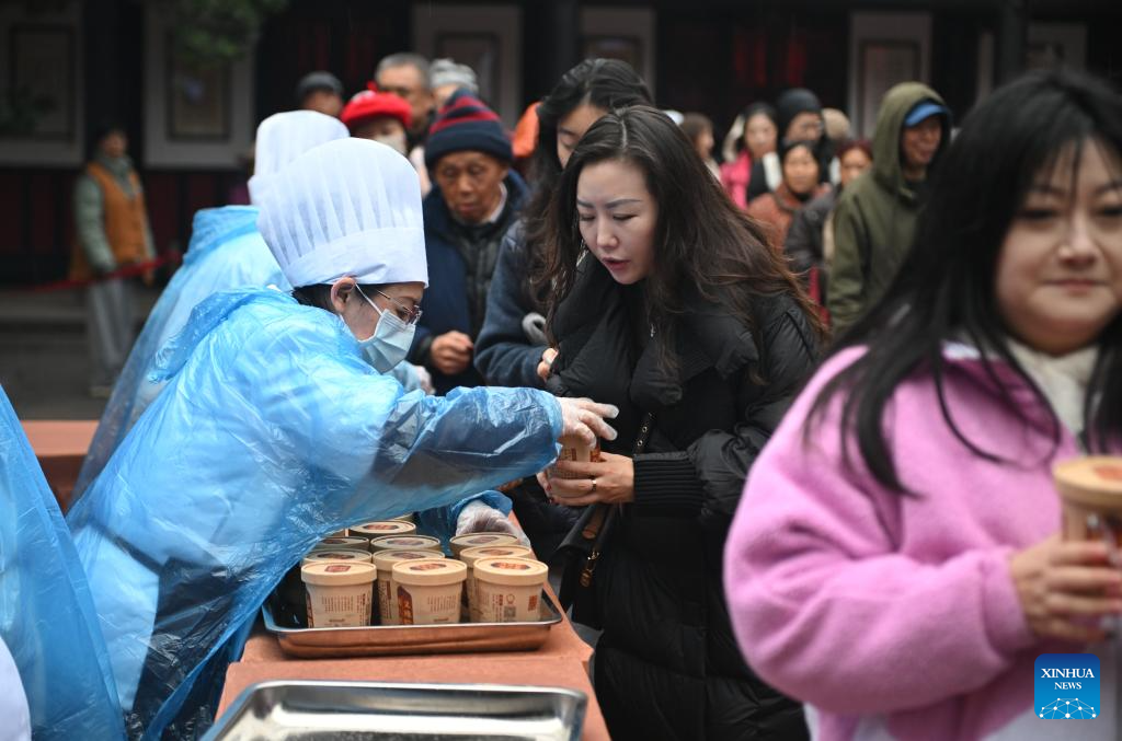Staff members offer visitors free Laba porridge at Wenshu Temple in Chengdu, southwest China's Sichuan Province, Jan. 7, 2025. This year's Laba Festival falls on Tuesday. (Xinhua/Liu Kun)