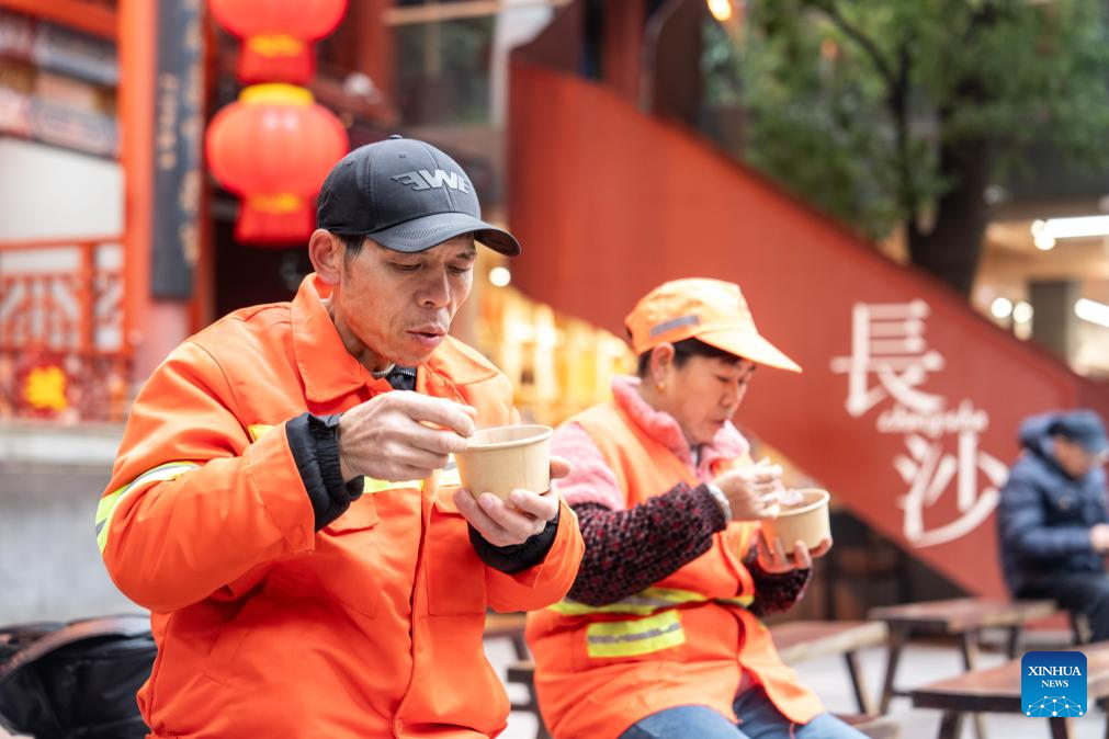 Sanitary workers eat free Laba porridge in Changsha, central China's Hunan Province, Jan. 7, 2025. This year's Laba Festival falls on Tuesday. (Xinhua/Chen Sihan)
