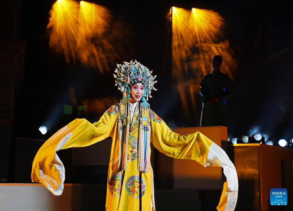 An artist performs on stage in Hongkou District, east China's Shanghai on April 14, 2023. The Inlet, a fashion landmark located in Hongkou District of Shanghai, staged a Kunqu Opera themed concert titled "Kunplug". (Xinhua/Liu Ying)