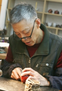 Wang Peibo repairs a porcelain object. (Photo/wccdaily.com)