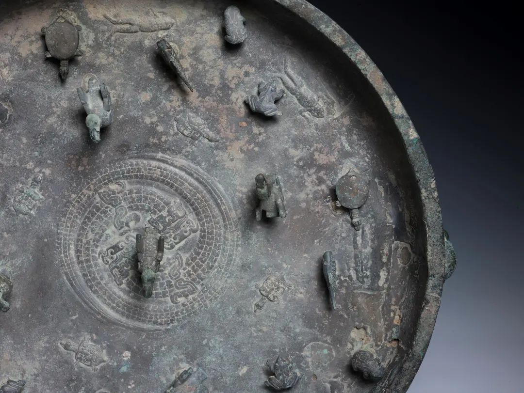 青銅製の晉公盤は洗面器のような道具で、「匜(イ)」と呼ばれる水差しとセットで使用される。匜で水を注ぎ、盤に水を張り、手を差し入れて洗う。晉公盤は中央部分にとぐろを巻く2匹の竜が精緻な浮き彫りでデザインされているほか、鳥や亀、魚、カエルなどさまざま動物の飾りがちりばめられている。なによりユニークなのは、これら19個ある動物の飾りはすべて360度回転させることができる點だ。水を流し込むと、盤上の動物たちは命を吹き込まれたように、水鳥は嘴を開けたり閉じたりし、亀は頭を出したり引っ込めたりし、魚は見えつ隠れつしながら泳いでいるように、カエルは追いかけっこをしているように見え、鳥のさえずりがいつまでも響き渡るように感じる。愛娘がまだ幼かった頃、一緒に池の畔で楽しく遊んだ、そんな美しい思い出の一瞬を再現したような作品となっている。