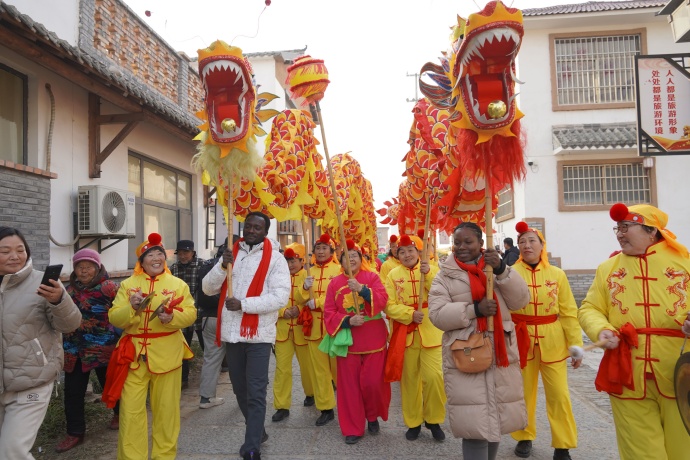 どらを打ち、太鼓を打ち、龍舞するのは地元の正月の風習で、新しい年の天候が順調で、五穀豊穣を祈る。このすばらしい公演は、現場の観衆から喝採を受け、外國人の友人から好評を博した。ジャマイカから來たBaileyさんは「本當の中國文化を體験し、農民がダンスで自分を表現しているのを見て、竜頭を掲げて村の人と一緒に踴ったのは素晴らしい経験でした?!工趣い盲俊?/p>