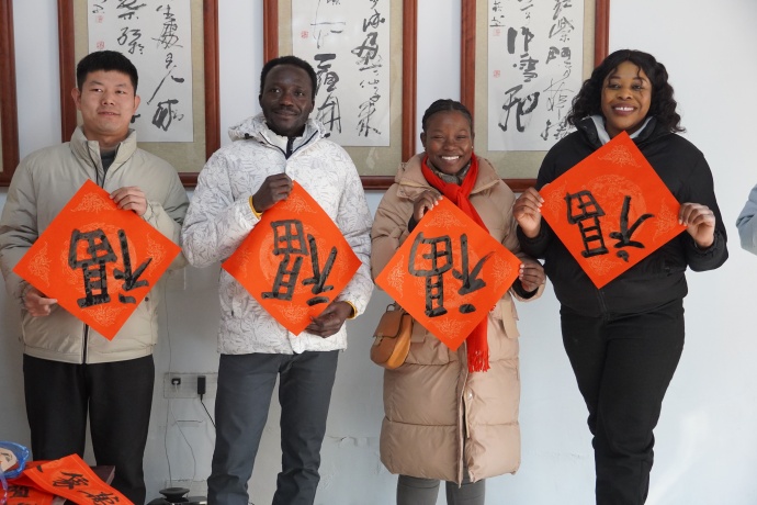 このほど、山東省菏沢市単県の北城街道の三官廟村で、ガーナ、ジャマイカなどの國から來た外國人の友人と現地の農民が一堂に會し、龍舞をしったり、腰鼓を打ったり、福の字を書いたり、餃子を作ったり、生け花をしたりして、「沒入式」の年俗(年末年始の恒例行事) 體験の中で、「中國の春節の雰囲気」を感じていた。