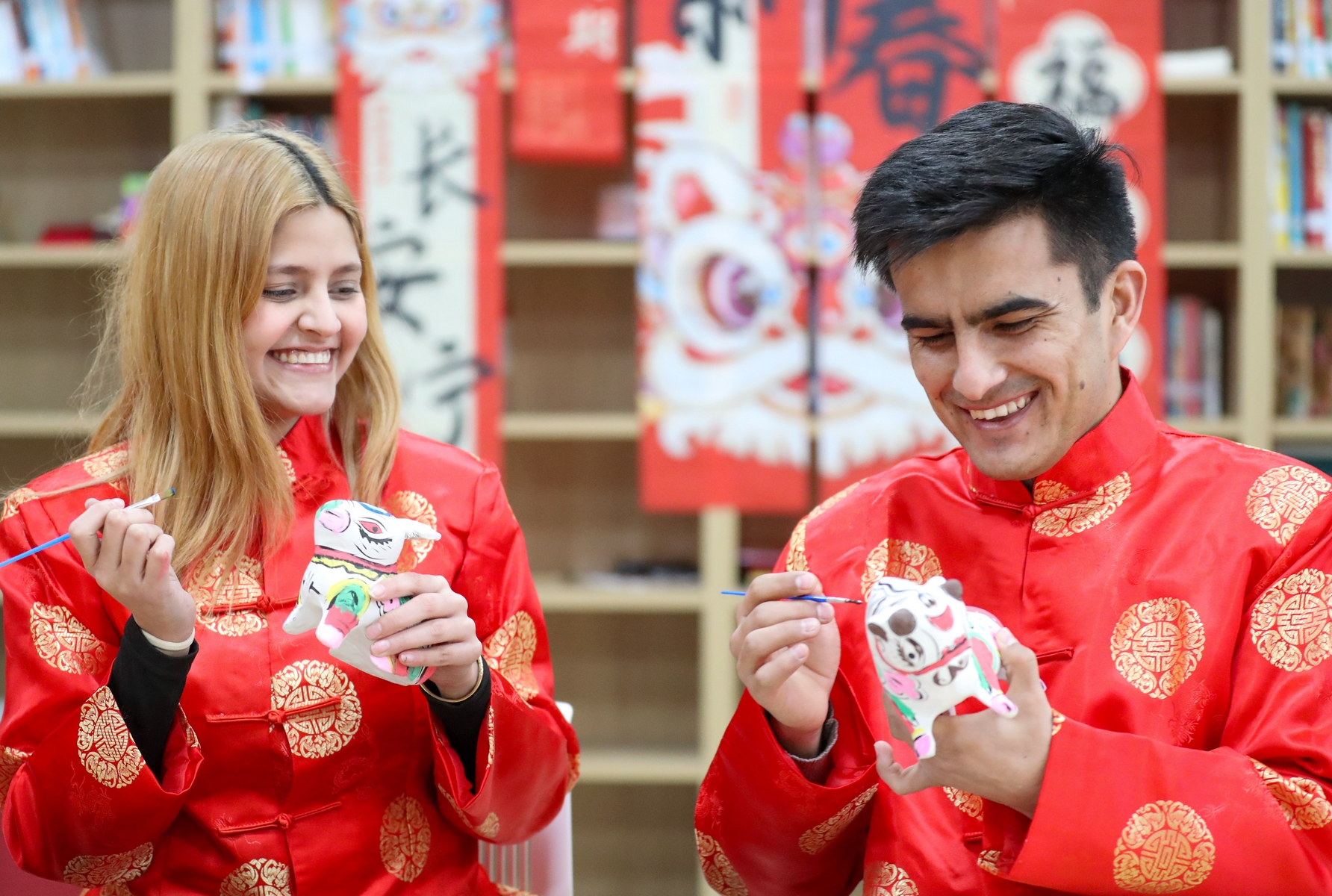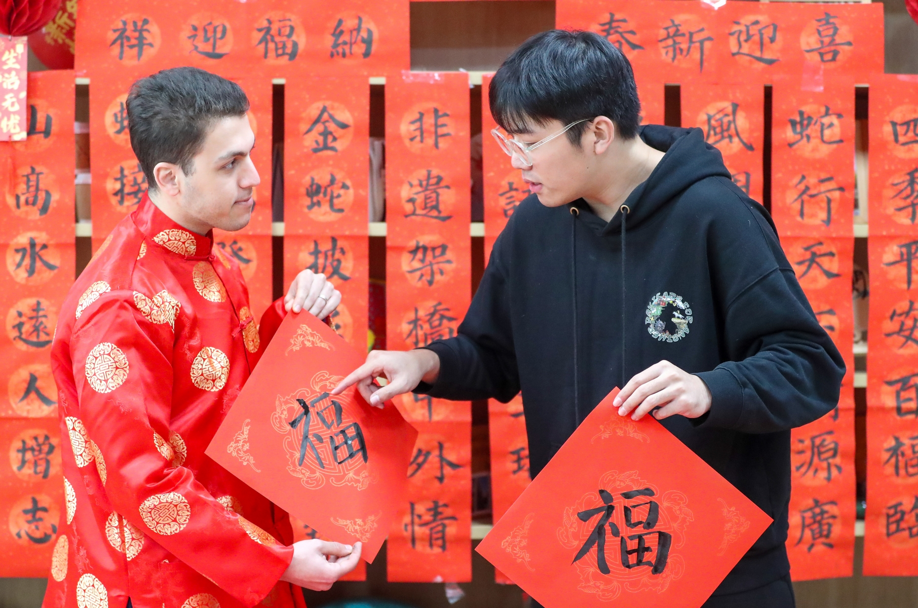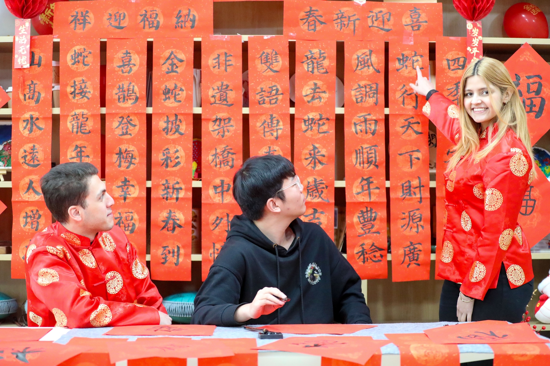 1月12日、山東科技大學が、在校生の若者たちとロシア、タジキスタン、ウズベキスタン、インドネシア、エルサルバドル、キリバスなどの國々から來た留學生を招いて、皆が一緒に校內の図書館で彩色泥塑、書道、漆染め、石刷りといった伝統文化を體験し、巳年の春節(舊正月、今年は1月29日)を楽しく迎えた。