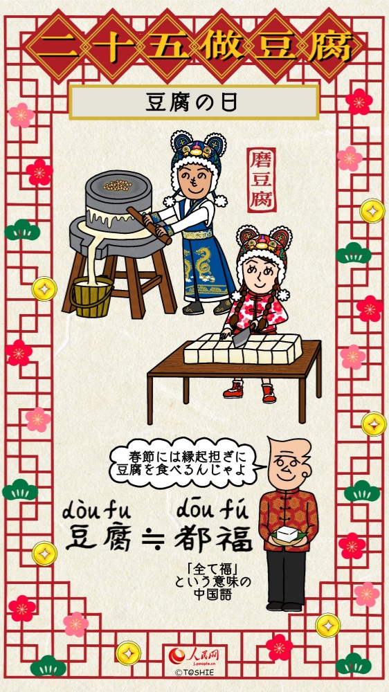 第3回は「做豆腐(豆腐の日)」。舊暦12月25日には、豆腐を作る風習がある。また地域によっては、「凍豆腐(凍り豆腐)」や「炸豆腐(揚げ豆腐)」をこの日に作る。今では実際に豆腐を作る家庭は多くないが、年越しに備え、必ず買い揃えておく食材の一つに豆腐がある。