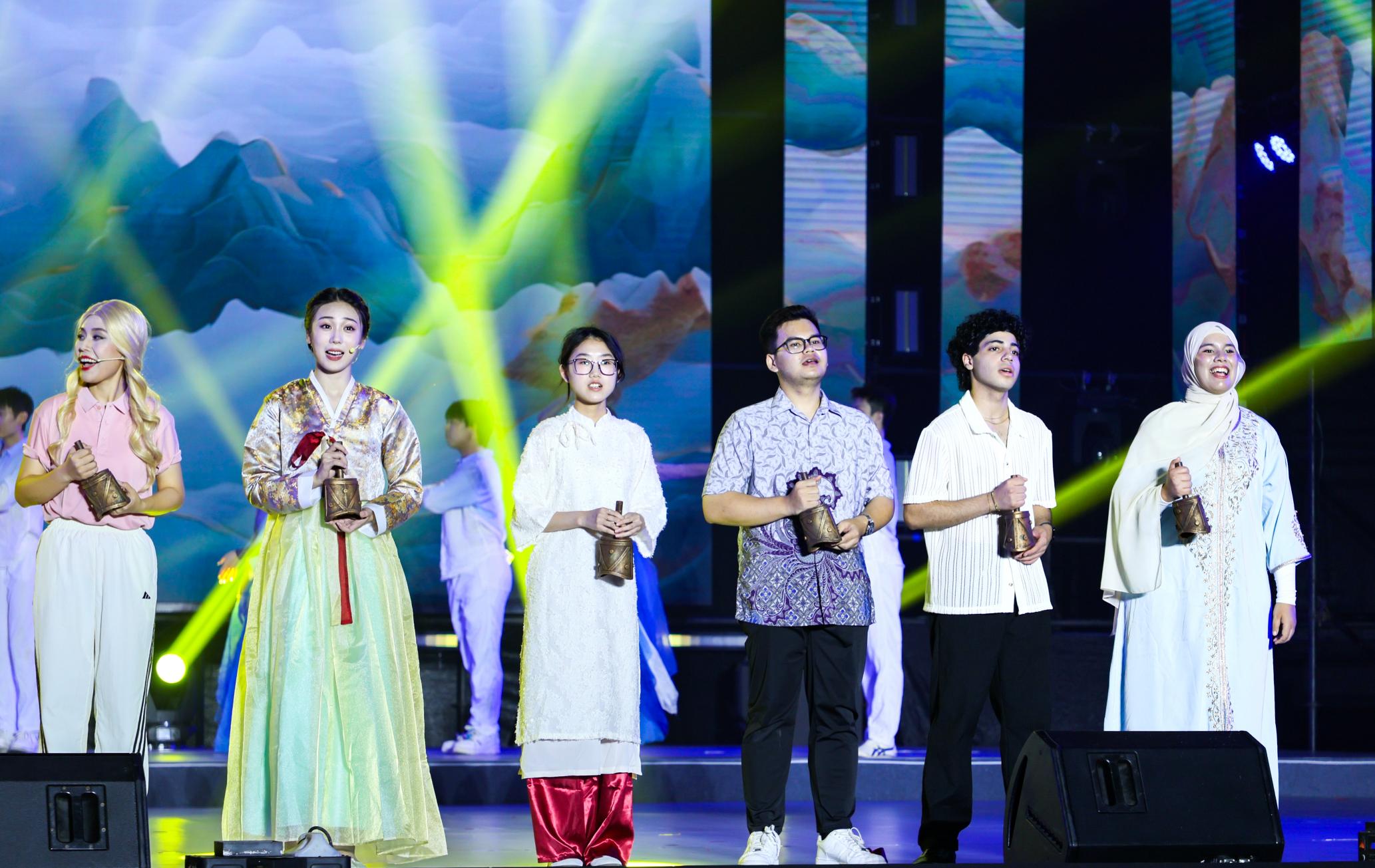 舞臺的燈光緩緩亮起,OKHUNOV ALIJON和朋友們身著本國特色服飾,從舞臺兩側相向而行,用流利的中文和各自的母語,飽含深情地誦讀“海上生明月,天涯共此時”等千古絕句,跨越國界的文化共情在吟誦間靜靜流淌。