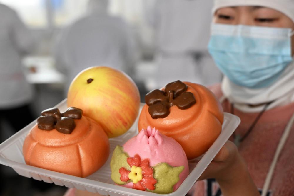 在威海益康花餑餑有限公司生產車間,一名工人展示剛蒸好的面食。新華社記者李紫恒 攝