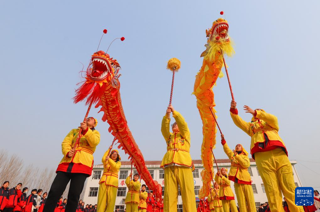 2月27日,河北省遵化市蘇家洼鎮下石河中學的學生在進行舞龍表演。新華社發(劉滿倉攝)
