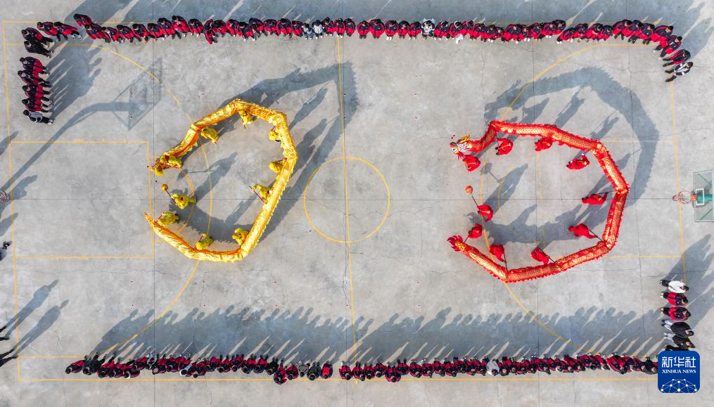 2月27日,河北省遵化市蘇家洼鎮下石河中學的學生在進行舞龍表演(無人機照片)。新華社發(劉滿倉攝)