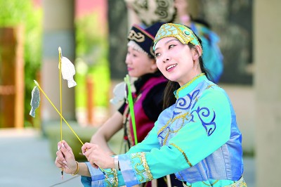 2022年9月4日,在黑龍江省撫遠市烏蘇鎮抓吉赫哲族村,赫哲族姑娘在表演民族舞蹈
