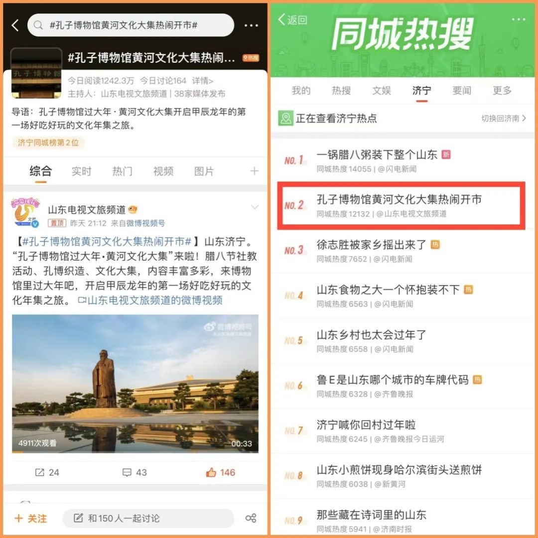 孔子博物館與山東文旅頻道聯合舉辦的“孔子博物館過大年·黃河文化大集”系列活動,作為山東電視文旅頻道“2024尋年味 趕大集”系列慢直播的首站,通過人民日報、央視頻、黨媒平臺、抖音、快手等十多個網絡平臺同步直播,全網收看量破2300萬,微博話題#孔子博物館黃河文化大集熱鬧開市#登上濟寧同城熱搜榜第2位。網友們可以通過線上線下多種形式,來博物館里過大年,體驗濃濃的“中國年味”,感受難以割舍的故鄉情懷。