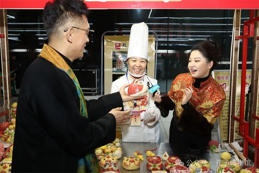 在“孔子博物館過大年·黃河文化大集”系列活動中,趕大集,美食必不可少。在北方,臘月二十八,開始蒸過年吃的面食,被稱之為“蒸壯”??赘x是一種極具代表性的北方面食,花糕、年糕、饃饃、花卷、糖包子、豆包子......花樣精美,且都具有美好寓意。除此之外,“黃河文化大集”上還有臘味、鹵味、糖葫蘆味兒......摻雜在一起,匯合成大家最期待的幸?!澳晡丁薄>€上的觀眾朋友們在通過直播“一探究竟”的同時,也可以親臨集市現場大飽口福。
