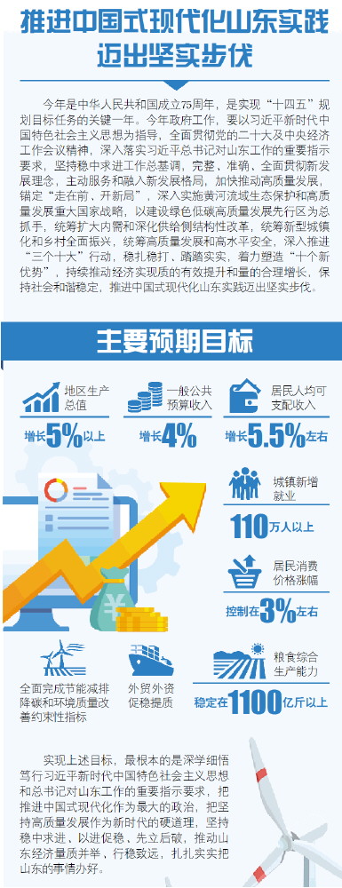 今年是中華人民共和國成立75周年,是實現“十四五”規劃目標任務的關鍵一年。今年政府工作,要以習近平新時代中國特色社會主義思想為指導,全面貫徹黨的二十大及中央經濟工作會議精神,深入落實習近平總書記對山東工作的重要指示要求,堅持穩中求進工作總基調,完整、準確、全面貫徹新發展理念,主動服務和融入新發展格局,加快推動高質量發展,錨定“走在前、開新局”,深入實施黃河流域生態保護和高質量發展重大國家戰略,以建設綠色低碳高質量發展先行區為總抓手,統籌擴大內需和深化供給側結構性改革,統籌新型城鎮化和鄉村全面振興,統籌高質量發展和高水平安全,深入推進“三個十大”行動,穩扎穩打、踏踏實實,著力塑造“十個新優勢”,持續推動經濟實現質的有效提升和量的合理增長,保持社會和諧穩定,推進中國式現代化山東實踐邁出堅實步伐。