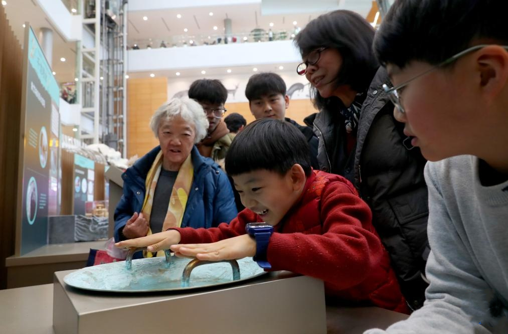 1月31日,上海甲辰龍年生肖特展開幕,小朋友在體驗青銅“龍洗”的共振效果。新華社發