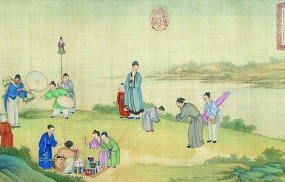 《太平春市圖卷》中的兩人相拜(丁觀鵬繪)臺北故宮博物院藏選自《古人的日常禮儀》