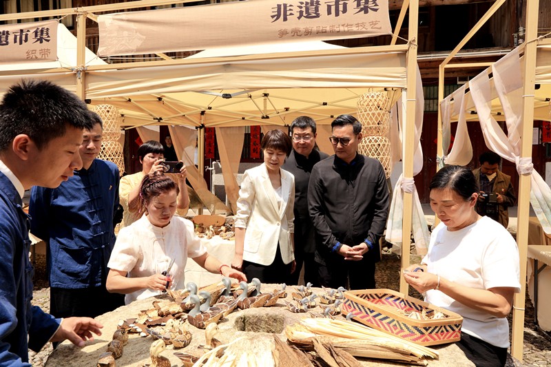 在盤峰鄉櫸溪村參觀磐安縣非遺市集。