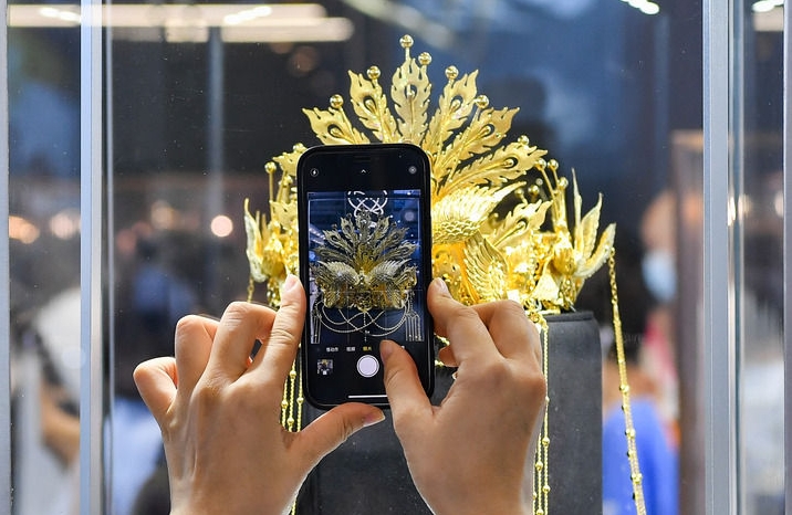 2022年7月29日,觀眾在消博會上拍攝老鳳祥展出的“鳳舞九天·金鳳冠”。新華社記者 楊冠宇 攝