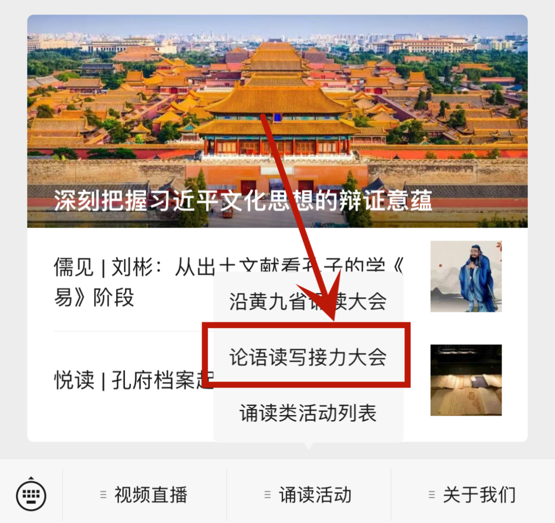 第一步:關注“尼山世界儒學中心”微信公眾號,菜單欄點擊“誦讀活動”,進入“論語讀寫接力大會”小程序。