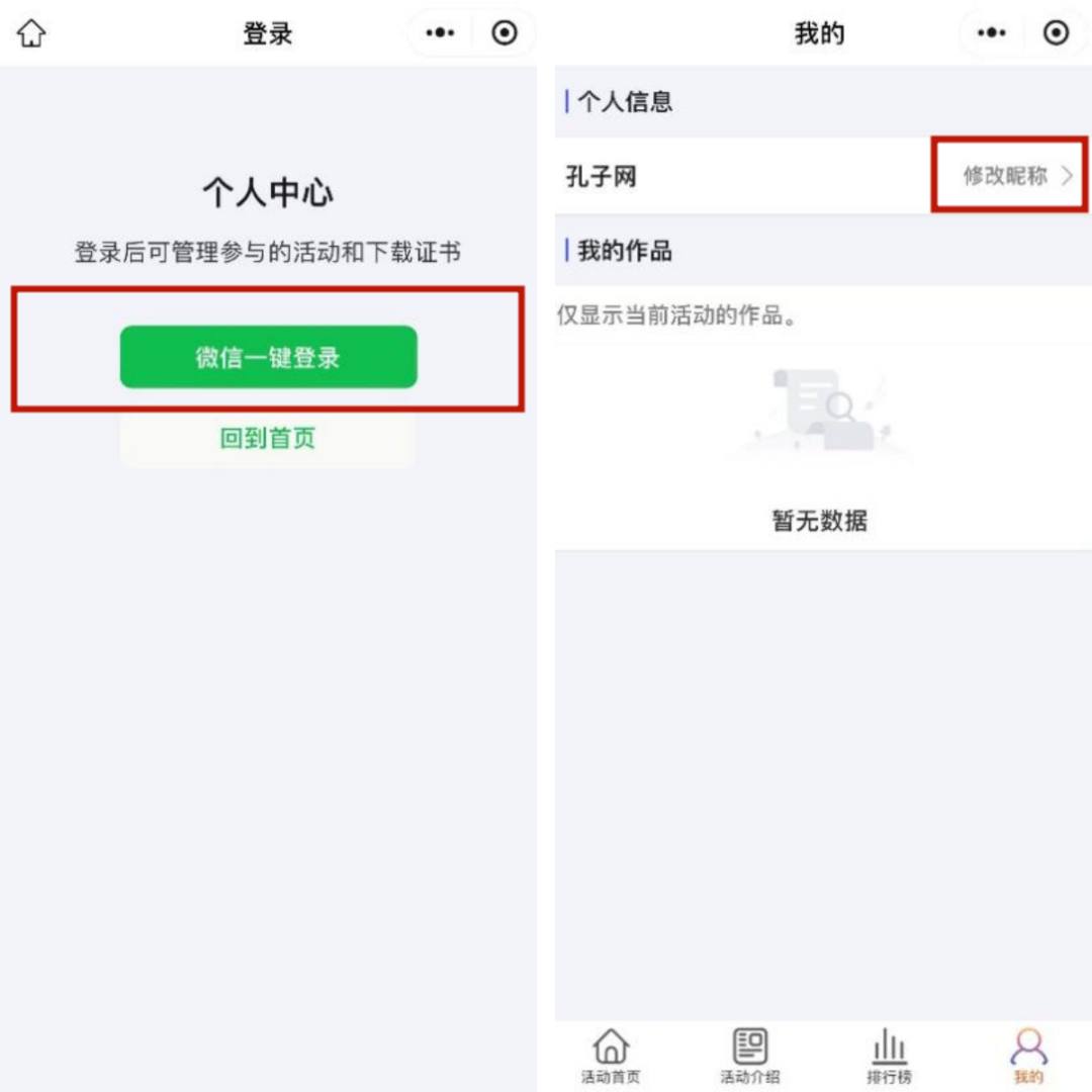 第二步:進入小程序后,點擊“我的”,進行“微信一鍵登錄”,修改參加本次活動的昵稱。為了便于統計,建議昵稱以“省市+單位/學校+姓名”進行命名。