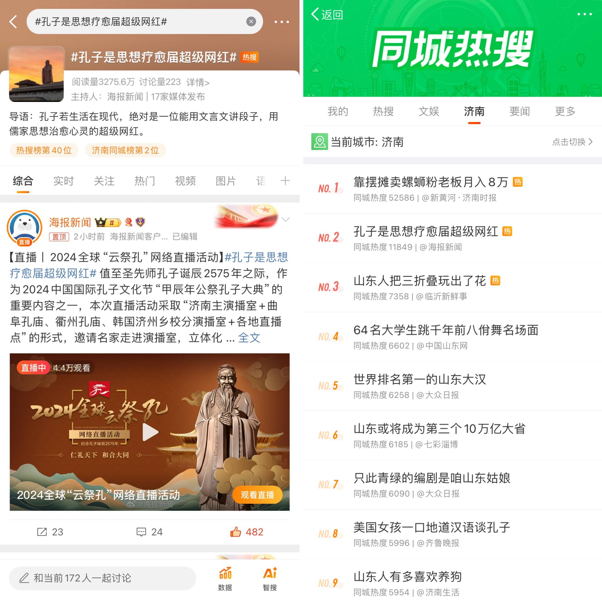 本次直播活動通過尼山世界儒學中心視頻號、中國孔子基金會視頻號、尼山世界文明論壇視頻號、中國孔子網融媒體各平臺、人民日報客戶端、新華社、央視網、央視頻、環球時報、中國網、大眾日報、新華日報、閃電新聞、海報新聞、新黃河客戶端、北京時間、天津津云客戶端、四川國際傳播中心、貴州國際傳播中心、南寧國際傳播中心、濟南國際傳播中心、寧波國際傳播中心、香港商報、澳門日報、埃及《中國周報》、中華微視Twitter賬號Facebook賬號、中東頭條Facebook賬號等100余家媒體平臺進行直播,吸引了3200余萬人次在線觀看。微博平臺#孔子是思想療愈屆超級網紅#話題熱度不斷攀升,閱讀量突破3300余萬,居同城熱搜榜第二名,形成了全方位、立體式、多渠道的傳播網絡。
