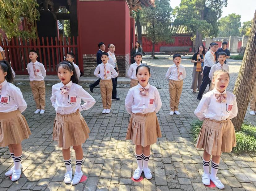 “學而不思則罔,思而不學則殆……”祭孔大典禮成后,在孔廟西華門、東華門兩側,近百位小學生頌唱《論語》經典名句,另一側書法老師帶領中外學生現場書寫《論語》,表達對至圣先賢的時代禮敬和對傳統文化的薪火相傳。