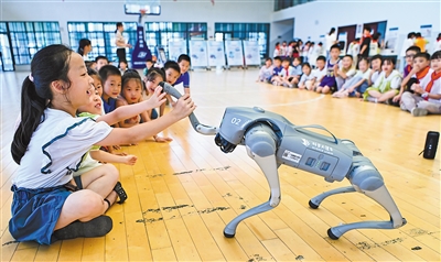 安徽省安慶市科普大篷車巡展活動走進岳西縣菖蒲鎮中心學校。圖為學生與機器狗互動。