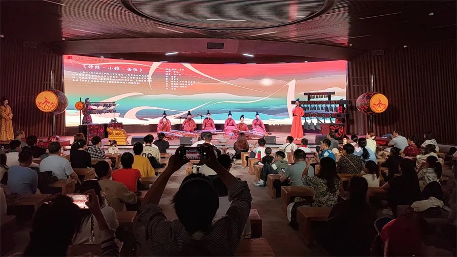 國慶期間,簫韶樂團累計演出28場次,服務觀眾3000余人。禮樂展演以古琴、編鐘、編磬等中國傳統樂器為主,演出曲目類型豐富。除傳統曲目外,還有《我和我的祖國》等經典愛國曲目。演出期間,鐘磬齊奏、古樂悠揚,觀眾們熱情洋溢、掌聲不斷,演職人員與觀眾互動頻繁。