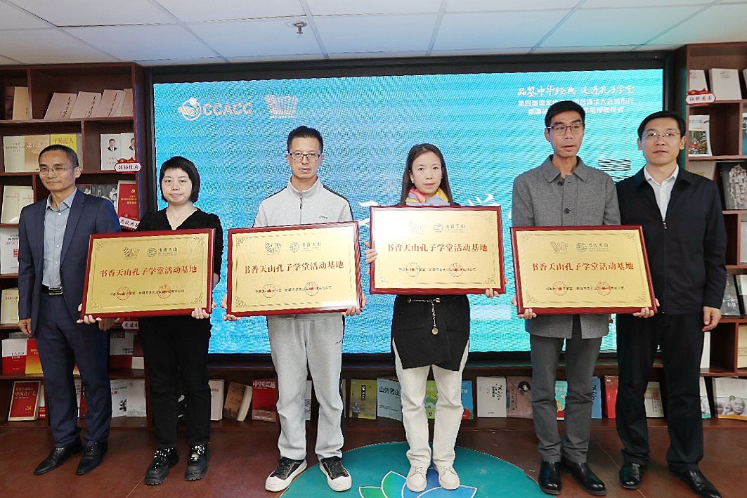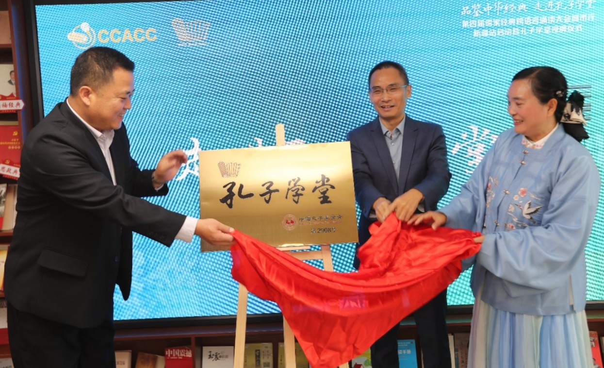 中國孔子基金會孔子學堂推進委員會副主任孫潤來宣讀了關于成立書香天山科技有限公司孔子學堂的批復函,并與韜奮基金會閱讀組織聯合會理事、新疆書香天山文化科技有限公司黨組織書記、總經理韓芝雄,全民閱讀推廣人、全國十佳播音主持教師、新疆書香天山科技有限公司副總經理、書香天山科技有限公司孔子學堂負責人何志涓共同為孔子學堂揭牌。